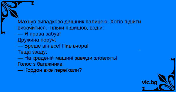 Projede auto zatáčkou, zastaví ho policajti a gratulují řidiči: „Jste první, kdo projel tuhle zatáčku bez dopravního přestupku.” Řidič poznamená: „No, kdybyste věděl, že nemám řidičák...” Z...