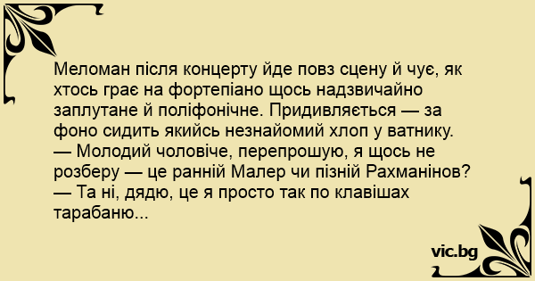 — Молодий чоловіче, перепрошую, я щось не розберу — це ранній Малер чи пізній Рахманінов?