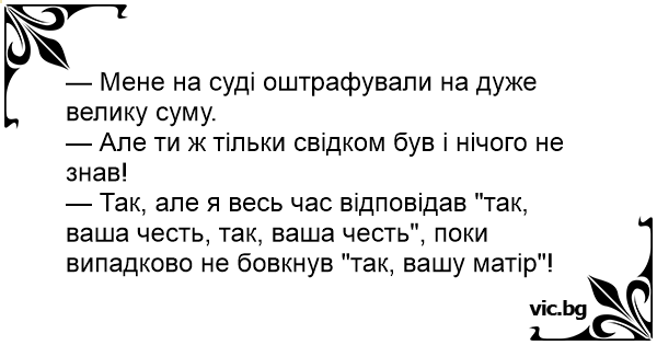 — Так, але я весь час відповідав "так, ваша честь, так, ваша честь", поки випадково не бовкнув "так, вашу матір"!