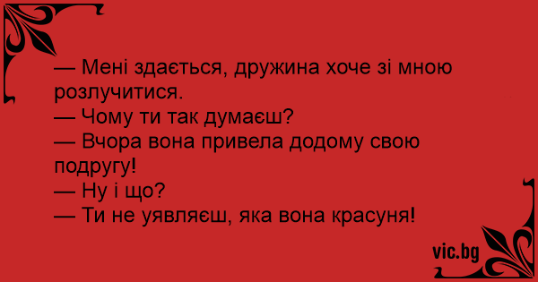 - Мне кажется, жена хочет развестись со мной. - Почему ты так думаешь? - Вчера она привела к нам свою подругу. - Ну и что? - Как что? Ты не представляешь себе, какая это красавица!