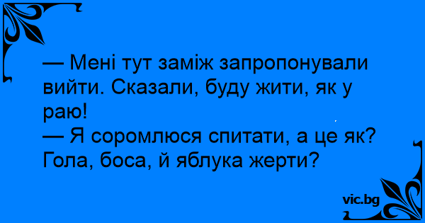 — Мені тут заміж запропонували вийти. Сказали, буду жити, як у раю!