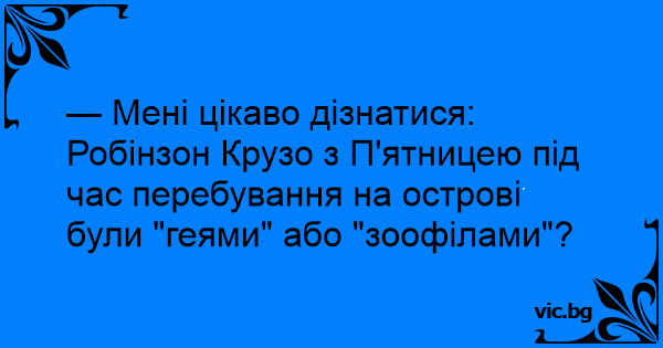 — Мені цікаво дізнатися: Робінзон Крузо з П'ятницею під час перебування на острові були "геями" або "зоофілами"?