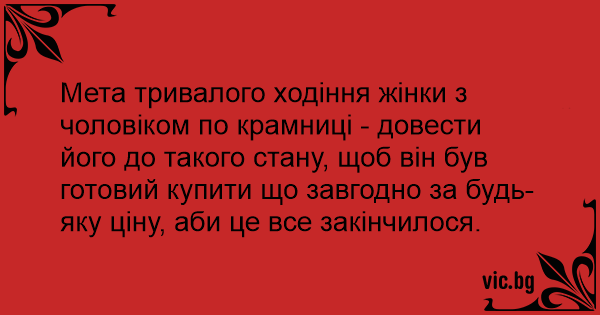 Мета тривалого ходіння жінки з чоловіком по крамниці - довести його до такого стану, щоб він був готовий купити що завгодно за будь-яку ціну, аби це все закінчилося.