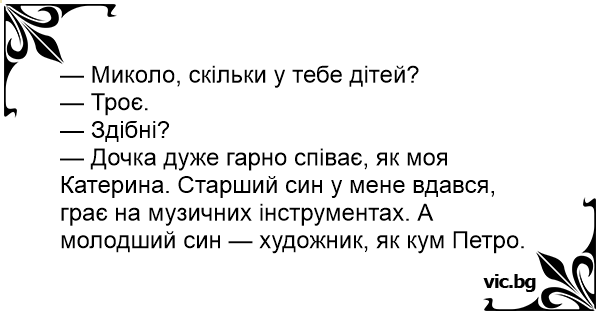 — Дочка дуже гарно співає, як моя Катерина. Старший син у мене вдався, грає на музичних інструментах. А молодший син — художник, як кум Петро.