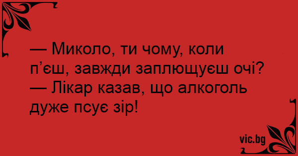 — Миколо, ти чому, коли п’єш, завжди заплющуєш очі?