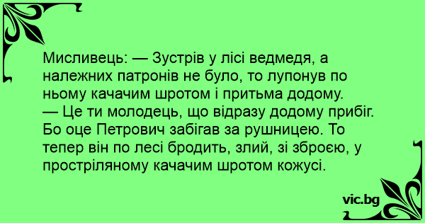 Мисливець: — Зустрів у лісі ведмедя, а належних патронів не було, то лупонув по ньому качачим шротом і притьма додому.