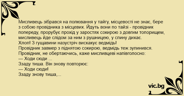 Мисливець зібрався на полювання у тайгу, місцевості не знає, бере з собою провідника з місцевих. Йдуть вони по тайзі - провідник попереду, прорубує прохід у заростях сокирою з довгим топорищем, мисливець йде слідом за ним з рушницею, у спину дихає.