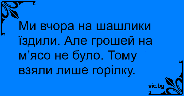 Ми вчора на шашлики їздили. Але грошей на м’ясо не було. Тому взяли лише горілку.