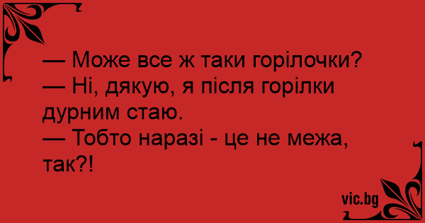 — Може все ж таки горілочки?<br />— Ні, дякую, я після горілки дурним стаю.<br />— Тобто наразі - це не межа, так?!
