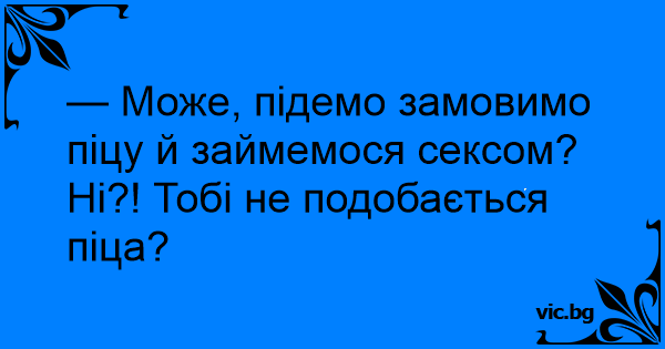 — Може, підемо замовимо піцу й займемося сексом? Ні?! Тобі не подобається піца?