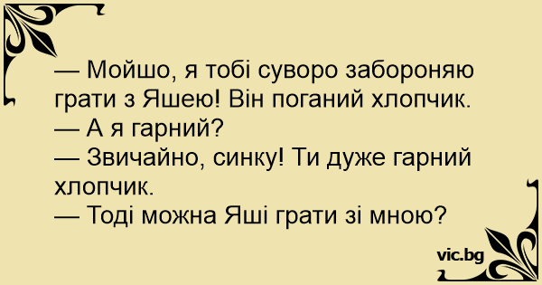 — Мойшо, я тобі суворо забороняю грати з Яшею! Він поганий хлопчик.