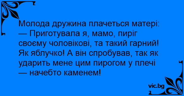 — Приготувала я, мамо, пиріг своєму чоловікові, та такий гарний! Як яблучко! А він спробував, так як ударить мене цим пирогом у плечі — начебто каменем!