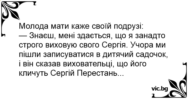— Знаєш, мені здається, що я занадто строго виховую свого Сергія. Учора ми пішли записуватися в дитячий садочок, і він сказав виховательці, що його кличуть Сергій Перестань...