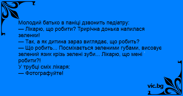 — Лікарю, що робити? Трирічна донька напилася зеленки!