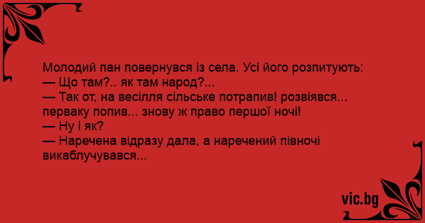 — Так от, на весілля сільське потрапив! розвіявся... перваку попив... знову ж право першої ночі!