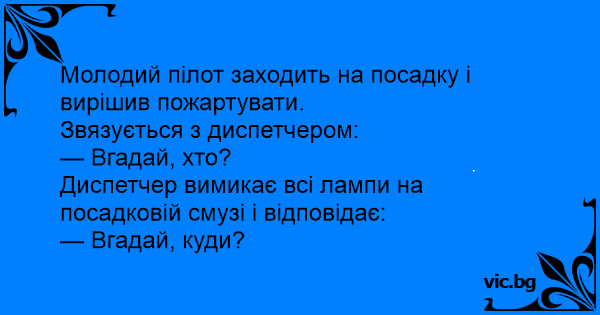 Mladý pilot, strašný frajer, jde na svoje první samostatné noční přistání. Na místo obvyklého hlášení se dispečerovi letiště zahlásí do vysílačky: „Hádej kdo?” Dispečer vypne světla na celé...