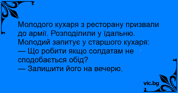 Молодого кухаря з ресторану призвали до армії. Розподілили у їдальню. Молодий запитує у старшого кухаря: