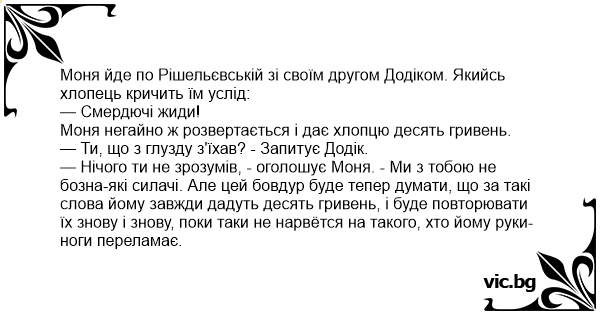 — Нічого ти не зрозумів, - оголошує Моня. - Ми з тобою не бозна-які силачі. Але цей бовдур буде тепер думати, що за такі слова йому завжди дадуть десять гривень, і буде повторювати їх знову і знову, поки таки не нарвётся на такого, хто йому руки-ноги переламає.