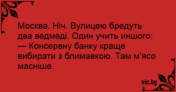 Москва. Ніч. Вулицею бредуть два ведмеді. Один учить иншого: