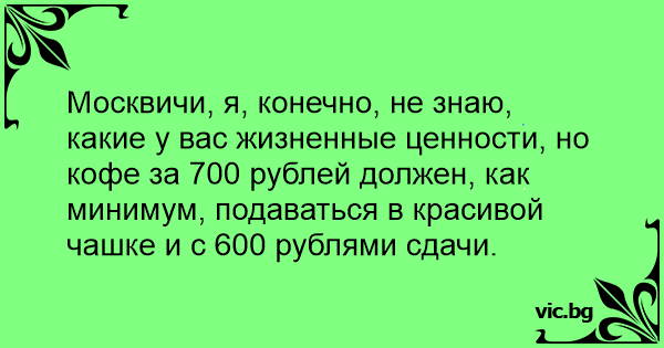 Москвичи, я, конечно, не знаю, какие у вас жизненные ценности, но кофе за 700 рублей должен, как минимум, подаваться в красивой чашке и с 600 рублями сдачи.