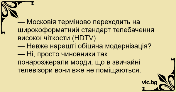 — Ні, просто чиновники так понарозжерали морди, що в звичайні телевізори вони вже не поміщаються.