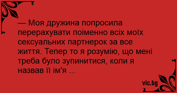 — Моя дружина попросила перерахувати поіменно всіх моїх сексуальних партнерок за все життя. Тепер то я розумію, що мені треба було зупинитися, коли я назвав її ім'я ...