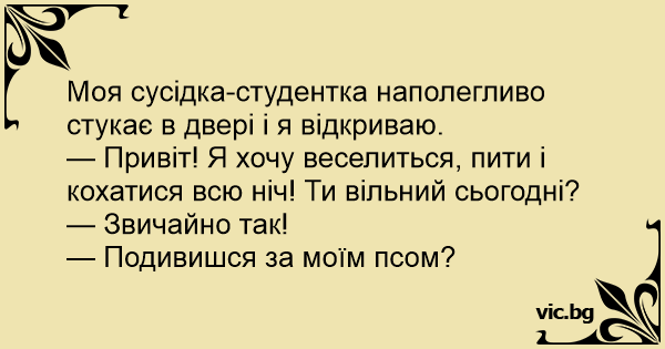— Привіт! Я хочу веселиться, пити і кохатися всю ніч! Ти вільний сьогодні?