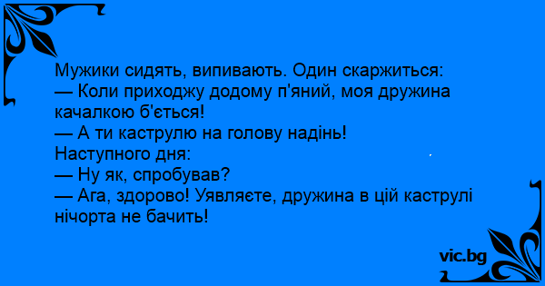 Мужики сидять, випивають. Один скаржиться: — Коли приходжу додому п'яний, моя дружина качалкою б'ється! — А ти каструлю на голову надінь! Наступного дня: — Ну як, спробував? — Ага, здорово! Уявляєте, дружина в цій каструлі нічорта не бачить!
