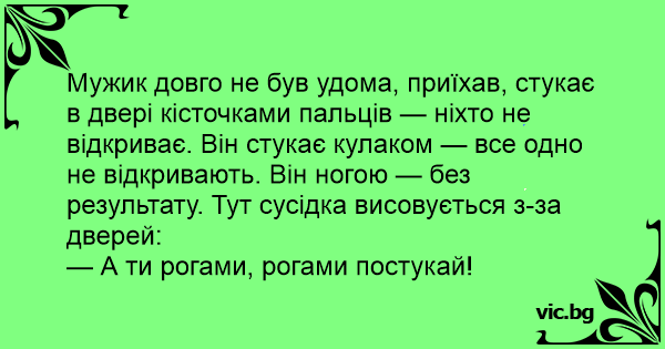 Мужик довго не був удома, приїхав, стукає в двері кісточками пальців — ніхто не відкриває. Він стукає кулаком — все одно не відкривають. Він ногою — без результату. Тут сусідка висовується з-за дверей: