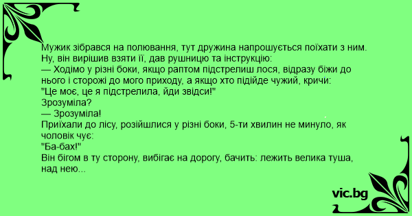 Мужик зібрався на полювання, тут дружина напрошується поїхати з ним. Ну, він вирішив взяти її, дав рушницю та інструкцію: