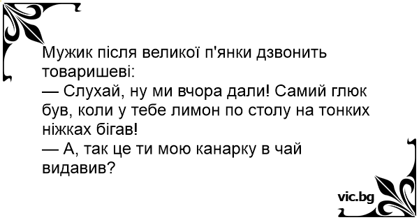 — Слухай, ну ми вчора дали! Самий глюк був, коли у тебе лимон по столу на тонких ніжках бігав!