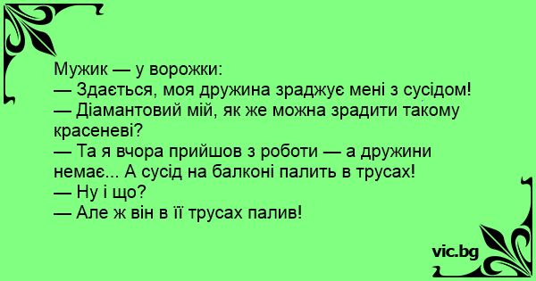 — Та я вчора прийшов з роботи — а дружини немає... А сусід на балконі палить в трусах!