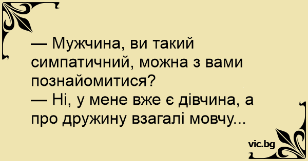 — Мужчина, ви такий симпатичний, можна з вами познайомитися?<br />— Ні, у мене вже є дівчина, а про дружину взагалі мовчу...