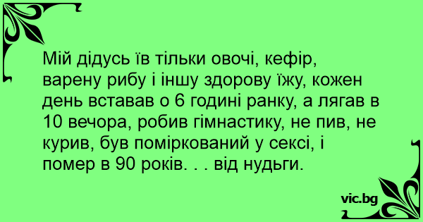 Мій дідусь їв тільки овочі, кефір, варену рибу і іншу здорову їжу, кожен день вставав о 6 годині ранку, а лягав в 10 вечора, робив гімнастику, не пив, не курив, був поміркований у сексі, і помер в 90 років. . . від нудьги.