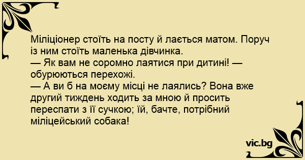 — А ви б на моєму місці не лаялись? Вона вже другий тиждень ходить за мною й просить переспати з її сучкою; їй, бачте, потрібний міліцейський собака!