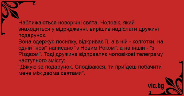Вона одержує посилку, відкриває її, а в ній - колготки, на одній "нозі" написано "з Новим Роком", а на іншій - "з Різдвом". Тоді дружина відправляє чоловікові телеграму наступного змісту: