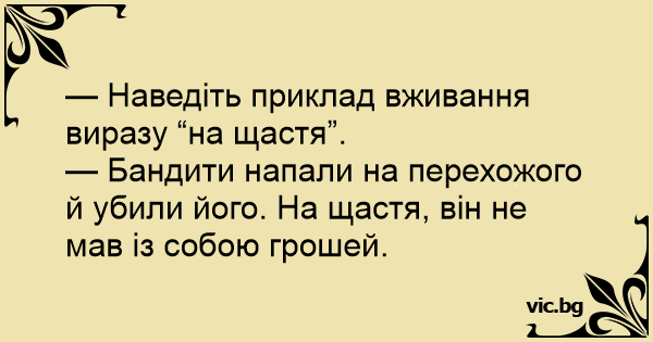 — Наведіть приклад вживання виразу “на щастя”.
