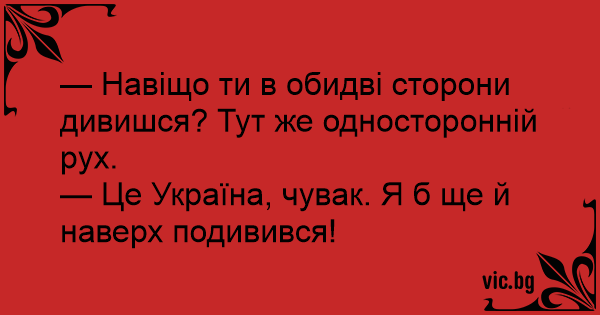 — Навіщо ти в обидві сторони дивишся? Тут же односторонній рух.