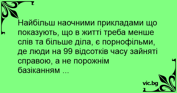 Найбільш наочними прикладами що показують, що в житті треба менше слів та більше діла, є порнофільми, де люди на 99 відсотків часу зайняті справою, а не порожнім базіканням ...
