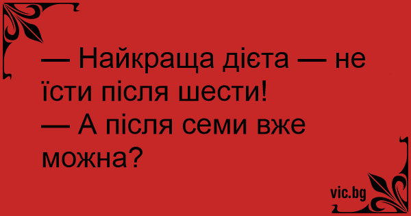 — Найкраща дієта — не їсти після шести!<br />— А після семи вже можна?