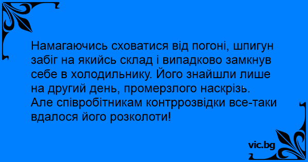 Намагаючись сховатися від погоні, шпигун забіг на якийсь склад і випадково замкнув себе в холодильнику. Його знайшли лише на другий день, промерзлого наскрізь.