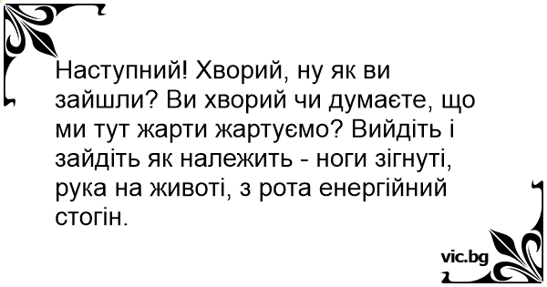 Наступний! Хворий, ну як ви зайшли? Ви хворий чи думаєте, що ми тут жарти жартуємо? Вийдіть і зайдіть як належить - ноги зігнуті, рука на животі, з рота енергійний стогін.