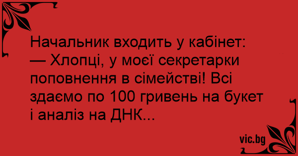 — Хлопці, у моєї секретарки поповнення в сімействі! Всі здаємо по 100 гривень на букет і аналіз на ДНК...
