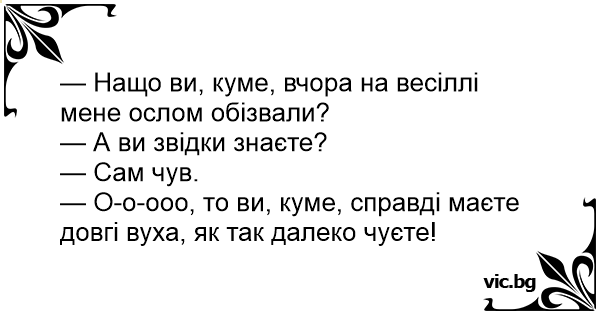 — Нащо ви, куме, вчора на весіллі мене ослом обізвали?