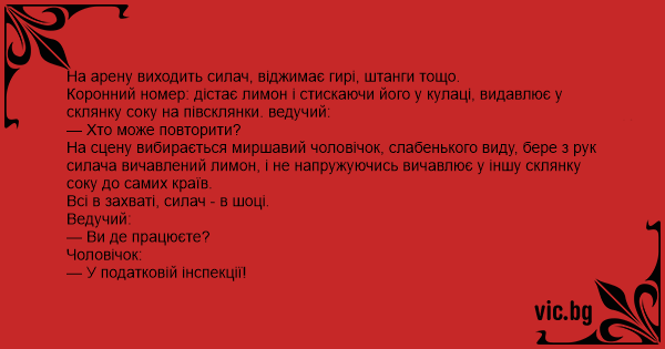 На сцену вибирається миршавий чоловічок, слабенького виду, бере з рук силача вичавлений лимон, і не напружуючись вичавлює у іншу склянку соку до самих країв.
