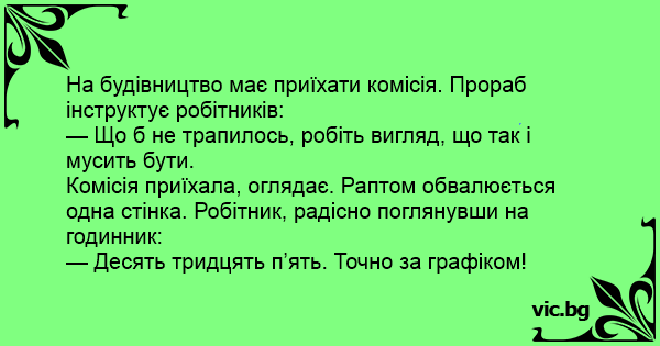 Комісія приїхала, оглядає. Раптом обвалюється одна стінка. Робітник, радісно поглянувши на годинник: