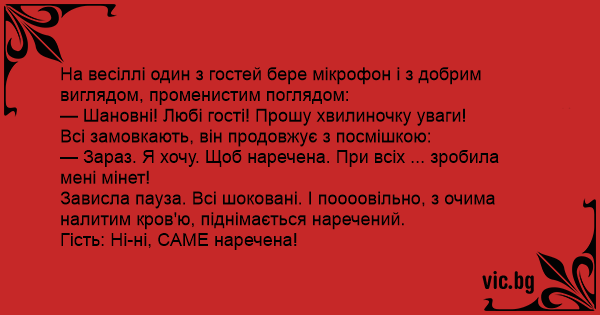 На весіллі один з гостей бере мікрофон і з добрим виглядом, променистим поглядом: