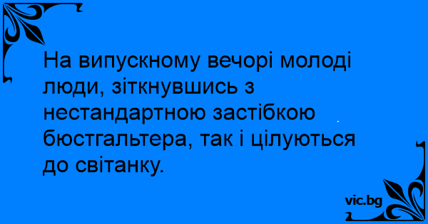 На випускному вечорі молоді люди, зіткнувшись з нестандартною застібкою бюстгальтера, так і цілуються до світанку.