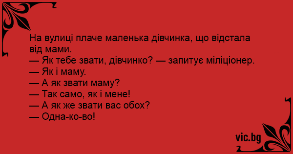 — Як тебе звати, дівчинко? — запитує міліціонер.