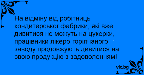 На відміну від робітниць кондитерської фабрики, які вже дивитися не можуть на цукерки, працівники лікеро-горілчаного заводу продовжують дивитися на свою продукцію з задоволенням!